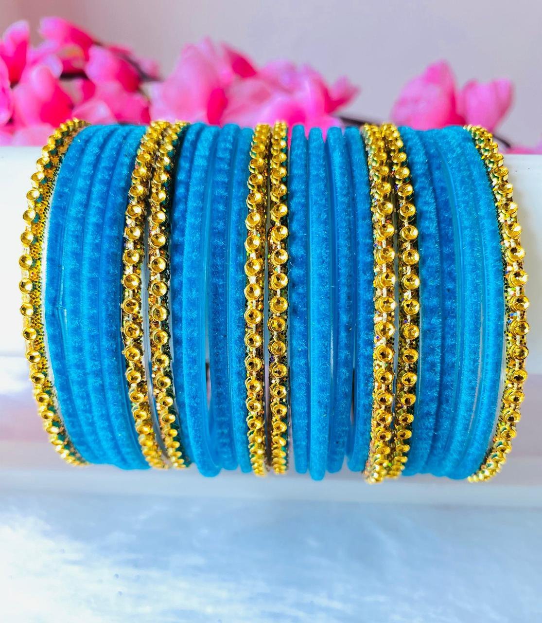 light blue velvet glass bangles with golden bangles (2 dozen)