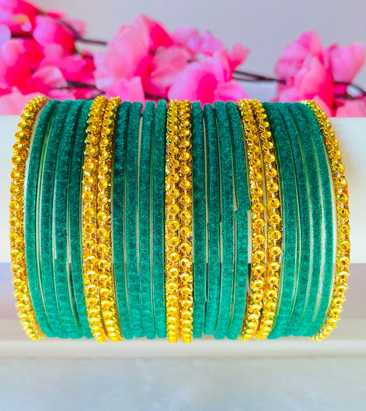 Expertly crafted and beautifully designed, these two dozen velvet glass bangles with gold bangles in dark green add a touch of elegance to any outfit. With 24 bangles, you can mix and match for a unique look every time. Elevate your style with these must-have accessories.