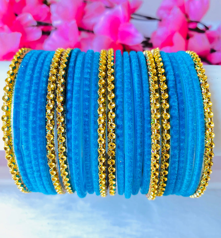 Add a touch of elegance to your wardrobe with our Two Dozen Velvet Glass Bangles. With a stunning gold finish and a light blue hue, these bangles are sure to be a showstopper. Made with high-quality glass and velvet, they offer ultimate comfort and durability. Perfect for any occasion, elevate your style with these 24 bangles.