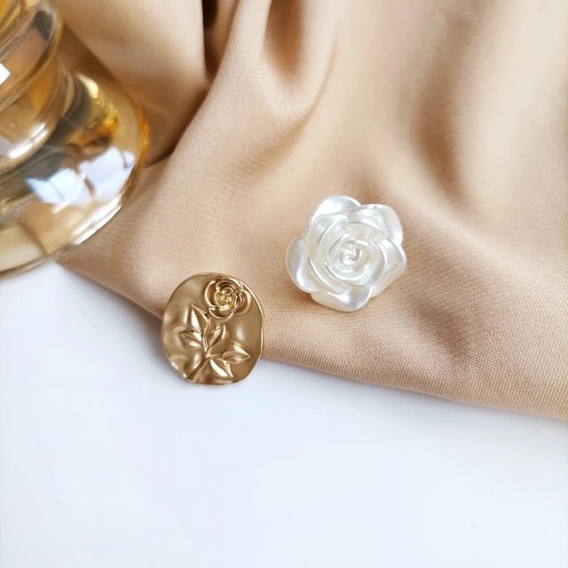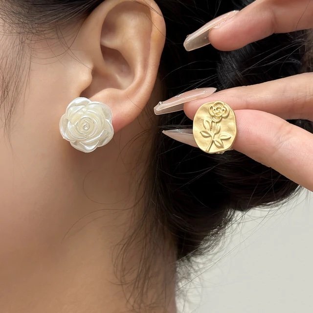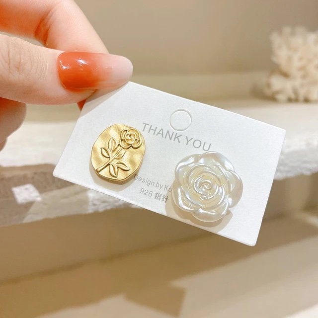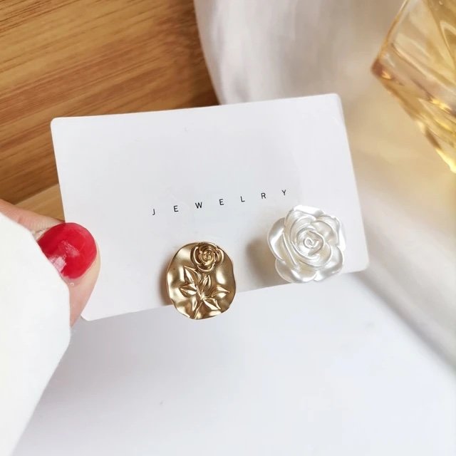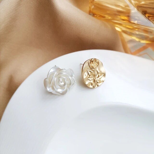 Exquisite Asymmetric Rose Flowers Imitation Pearl Stud Earrings for Women