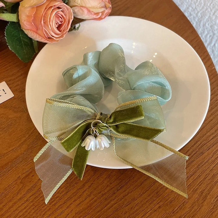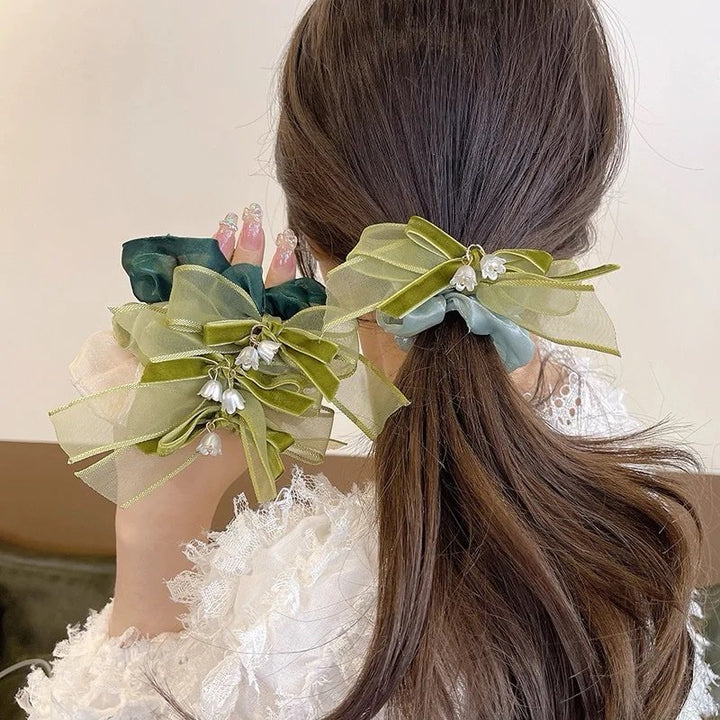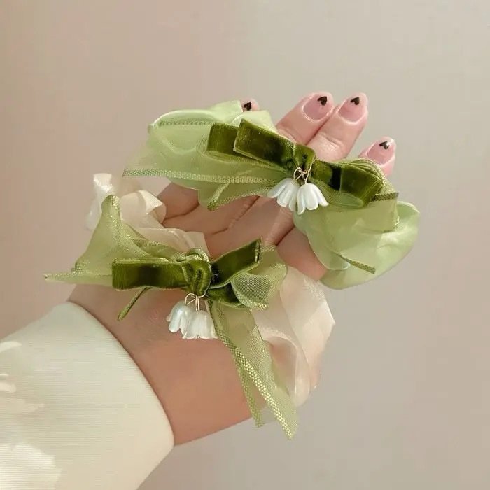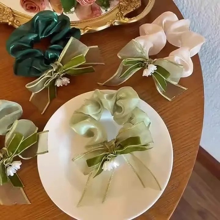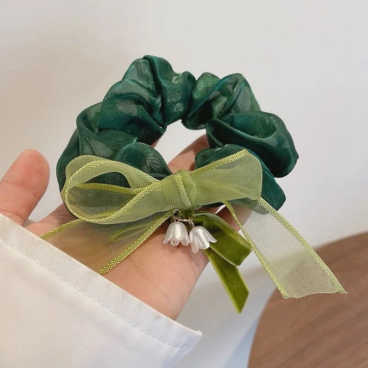 French white camellia with green bow hair scrunchie