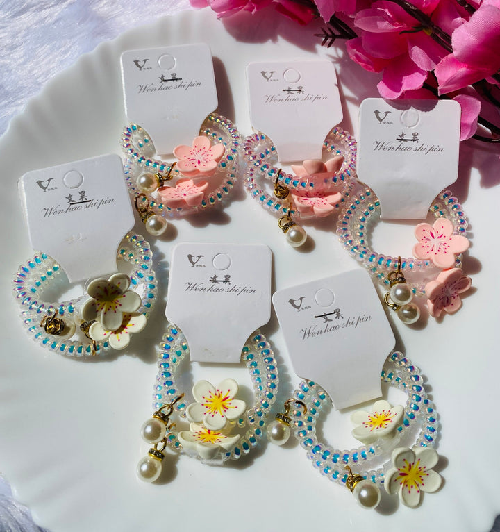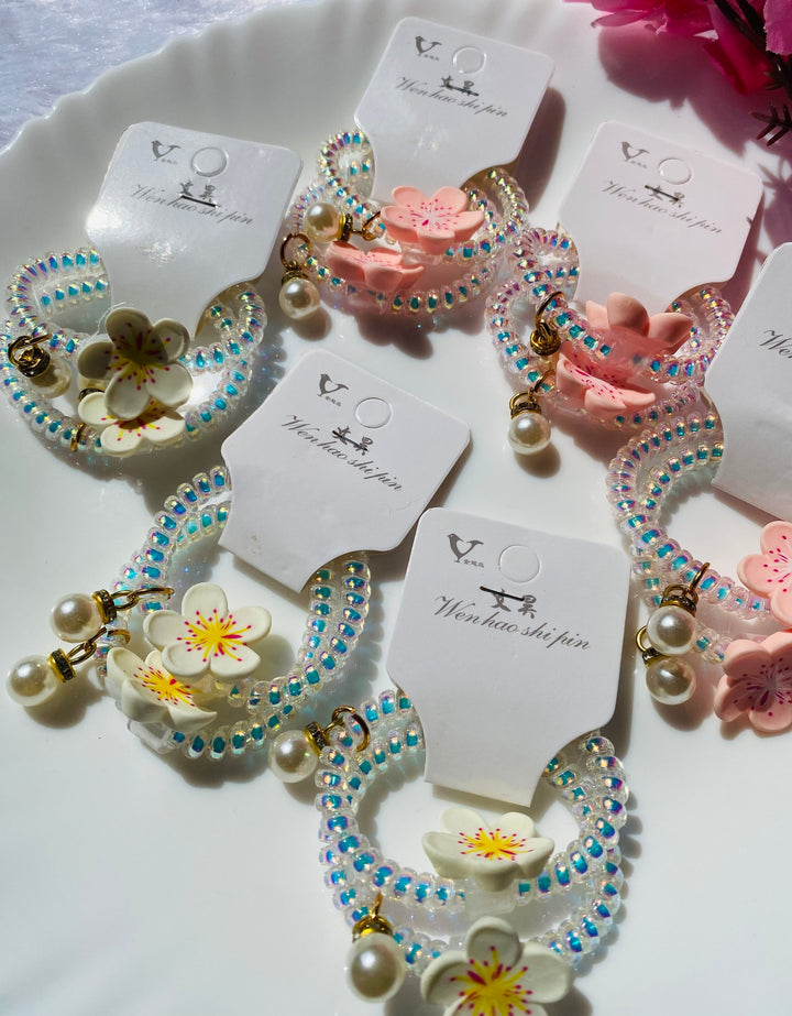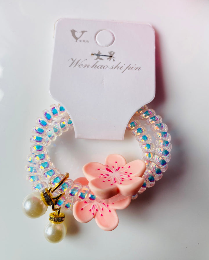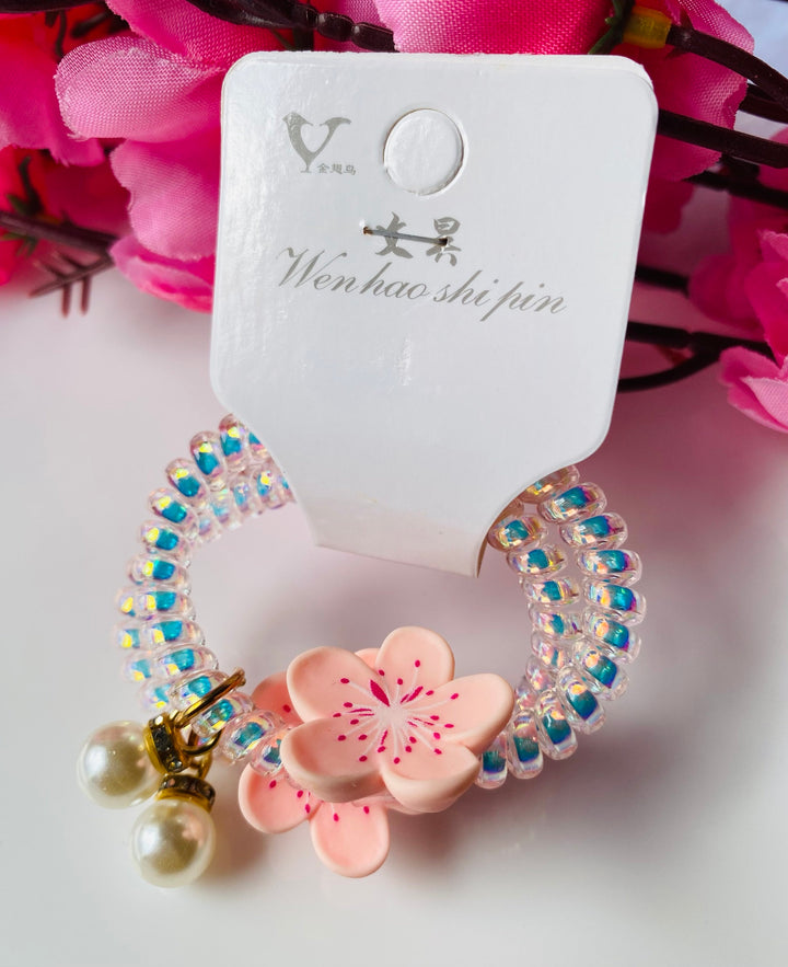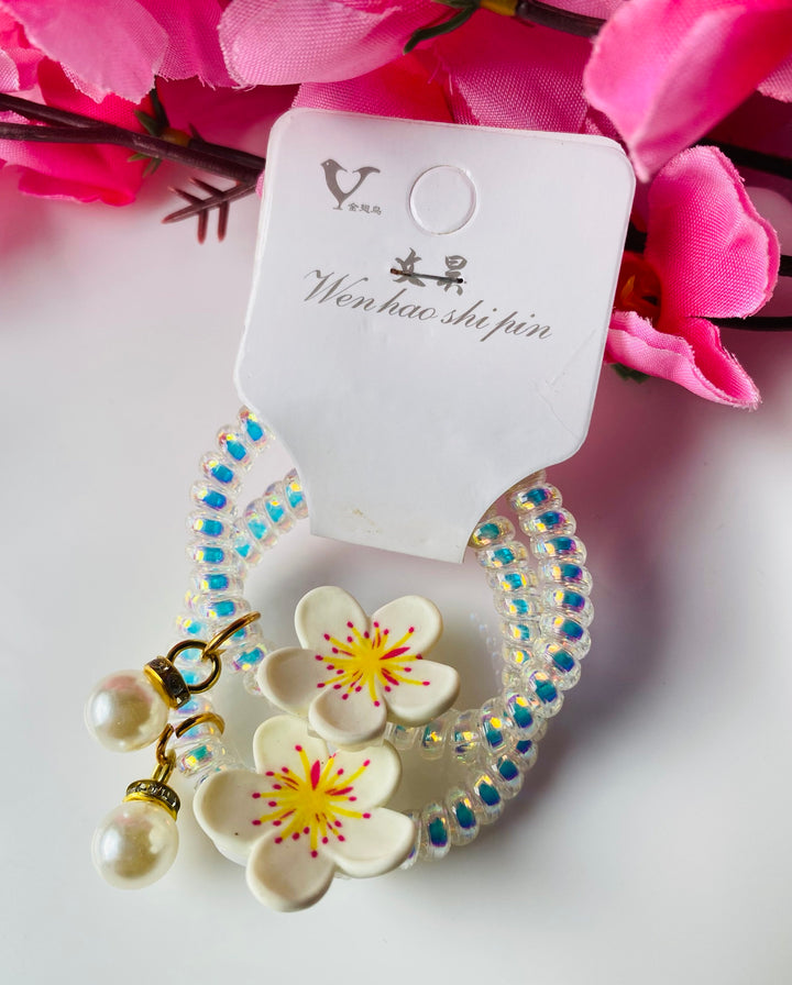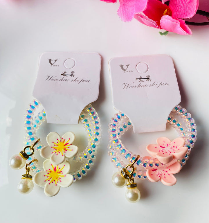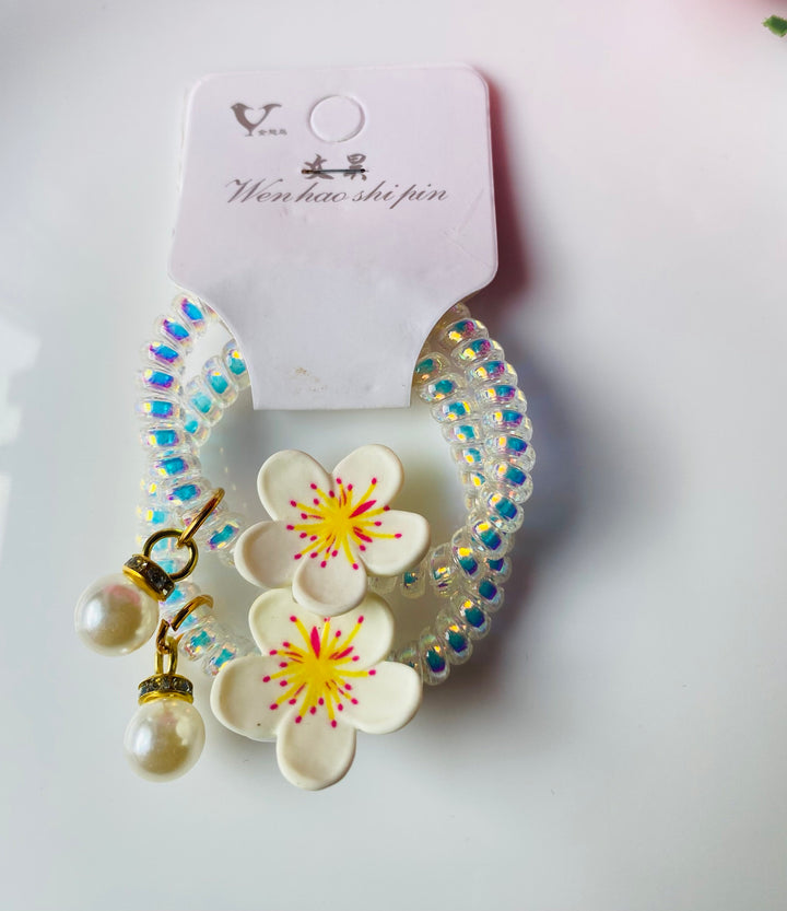 Holographic spiral hair tie floral with pearl hangings (set of 2)