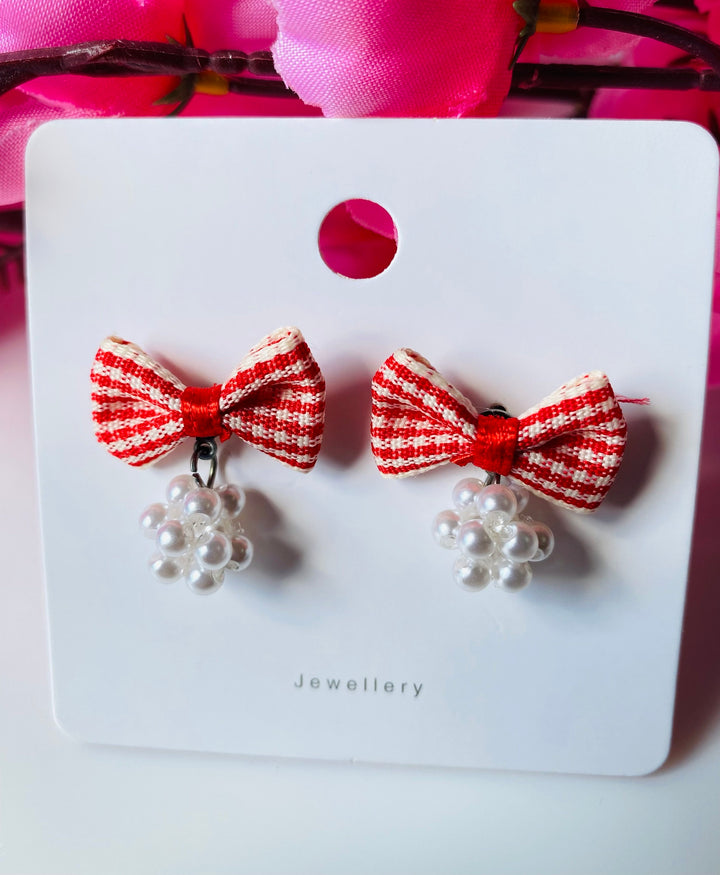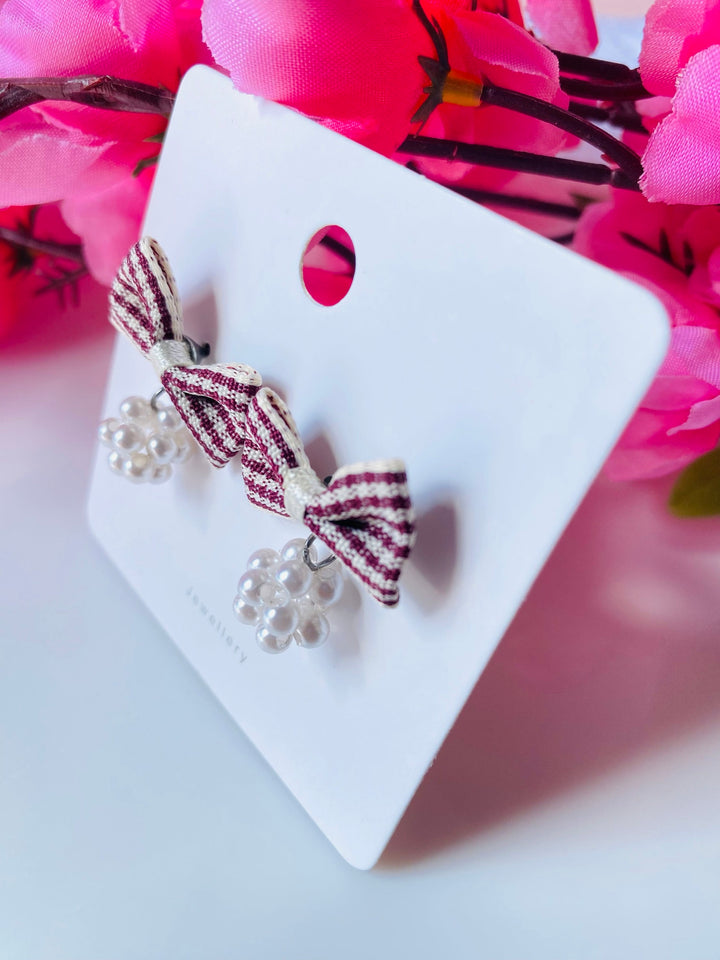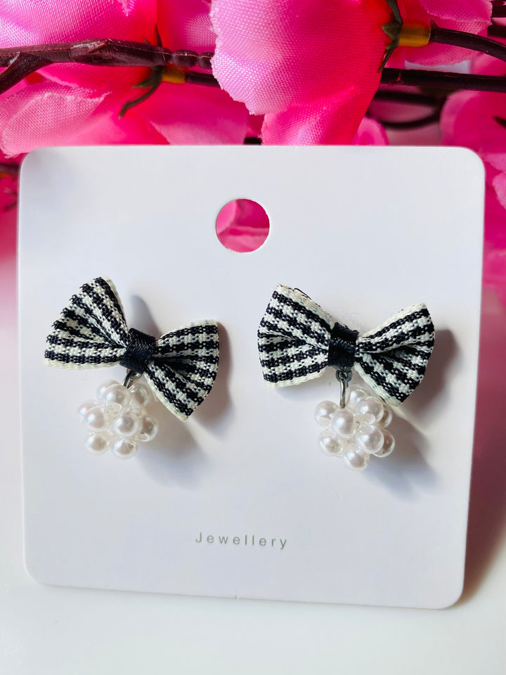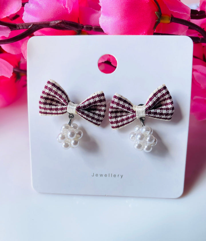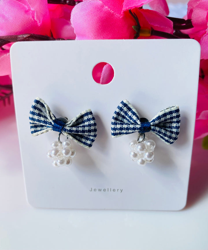 Korean style Checked Cloth bow knot with hanging pearls earrings