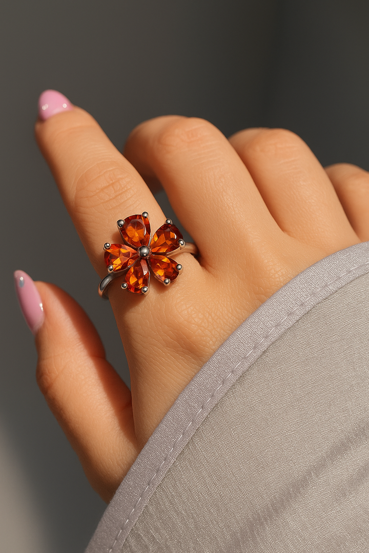 Ring with orange gemstones and a small diamond on a pink fabric background