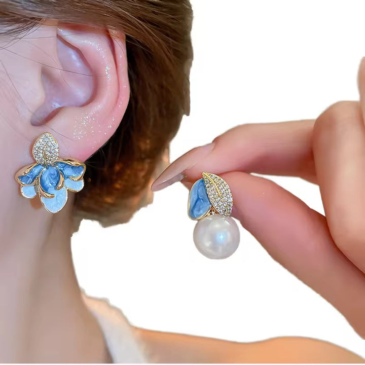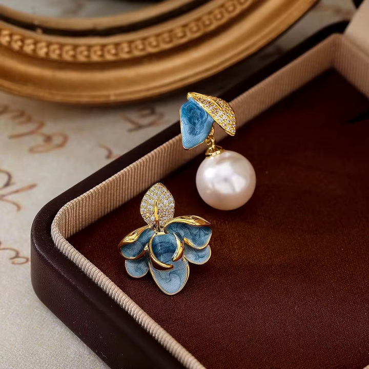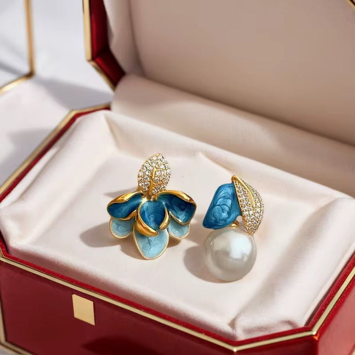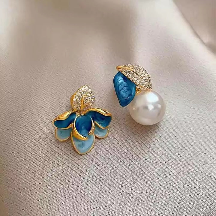 Mismatch blue pearl flower earrings