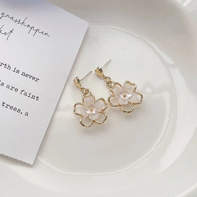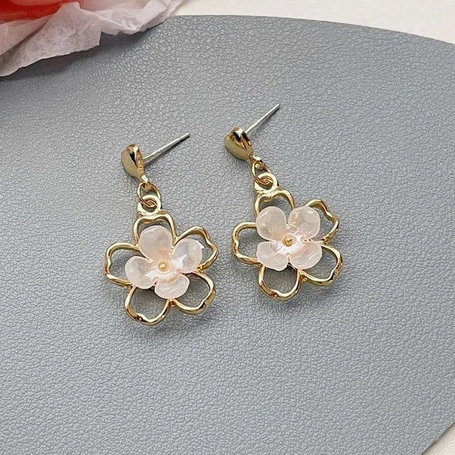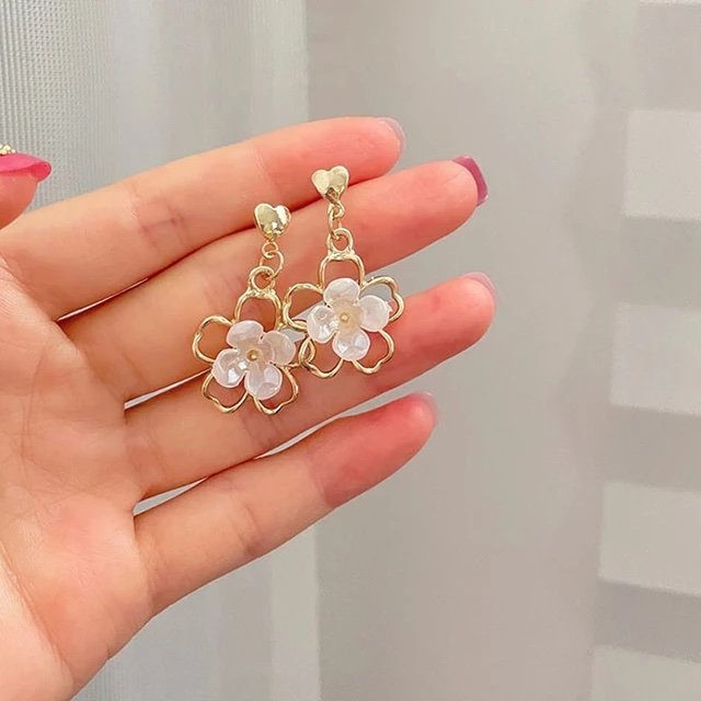 Korean style Gold plated with white flower heart drop earrings