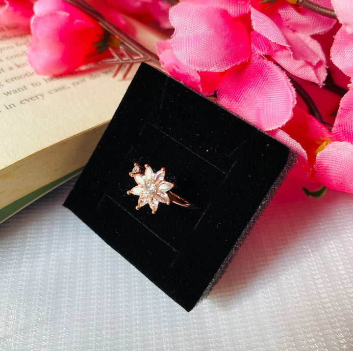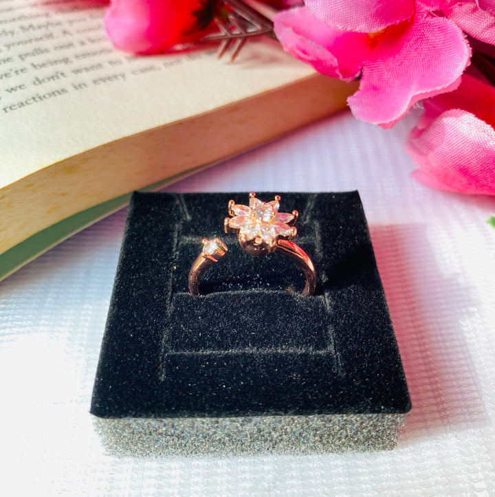 Experience elegance and versatility with our Rose Gold AD Stone Flower Spinner Adjustable Ring. This stunning piece features a beautiful flower design adorned with sparkling AD stones, set in high-quality rose gold. With its adjustable feature, this ring offers a perfect fit for any finger, making it a must-have for any fashion-forward individual. Add a touch of glamour to any outfit with this exquisite ring.