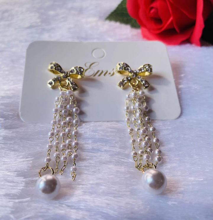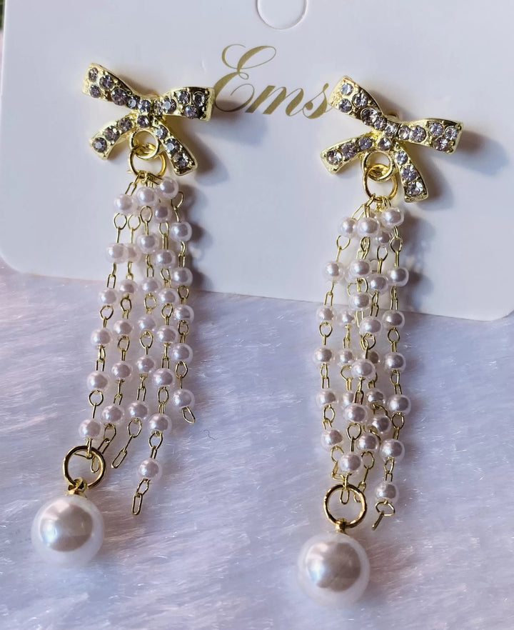 Add a touch of elegance to your party wear with our simple style bow knot pearl alloy rhinestone drop earrings. The delicately crafted bow design and sparkling rhinestone accents will make you stand out in any crowd. Made with high-quality materials, these earrings are the perfect accessory choice for any special occasion.