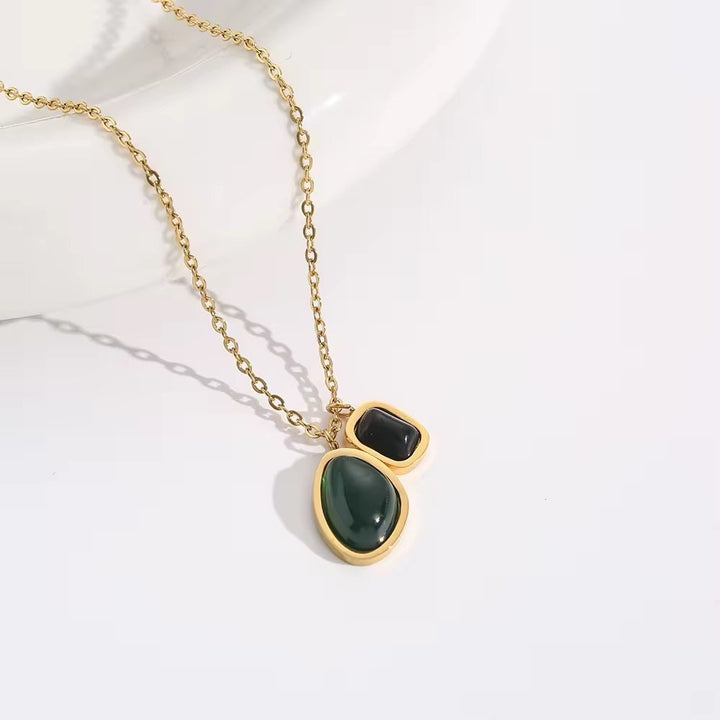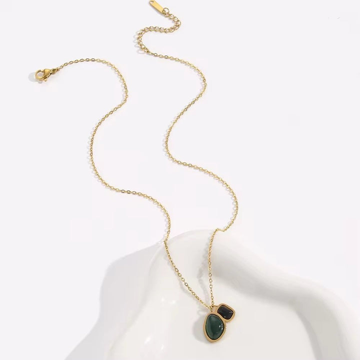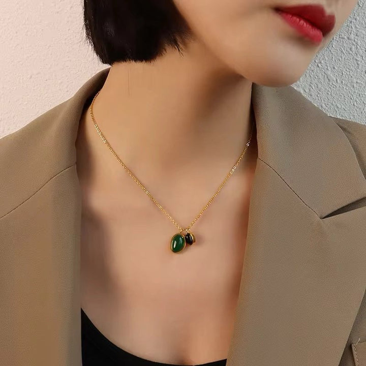 Expertly crafted with high-quality stainless steel, this gold necklace features a stunning oval green and black agate pendant. The unique color combination adds a touch of elegance to any outfit, making it the perfect accessory for any occasion. Experience the timeless beauty and durability of this necklace.
